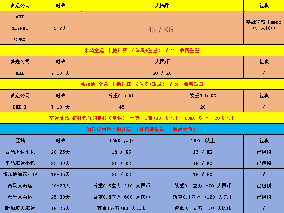 价格表更新日期2026-4-1起实行 节假日或海关抽查可能会有延误,请熟知 |